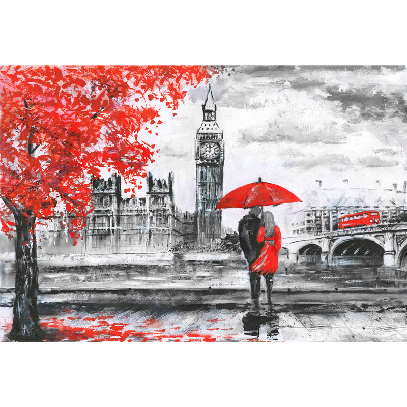 تابلو شاسی طرح خیابان لندن رودخانه و اتوبوس روی پل برج ساعت بیگ بن زن و مرد زیر چتر قرمز مدل T1012