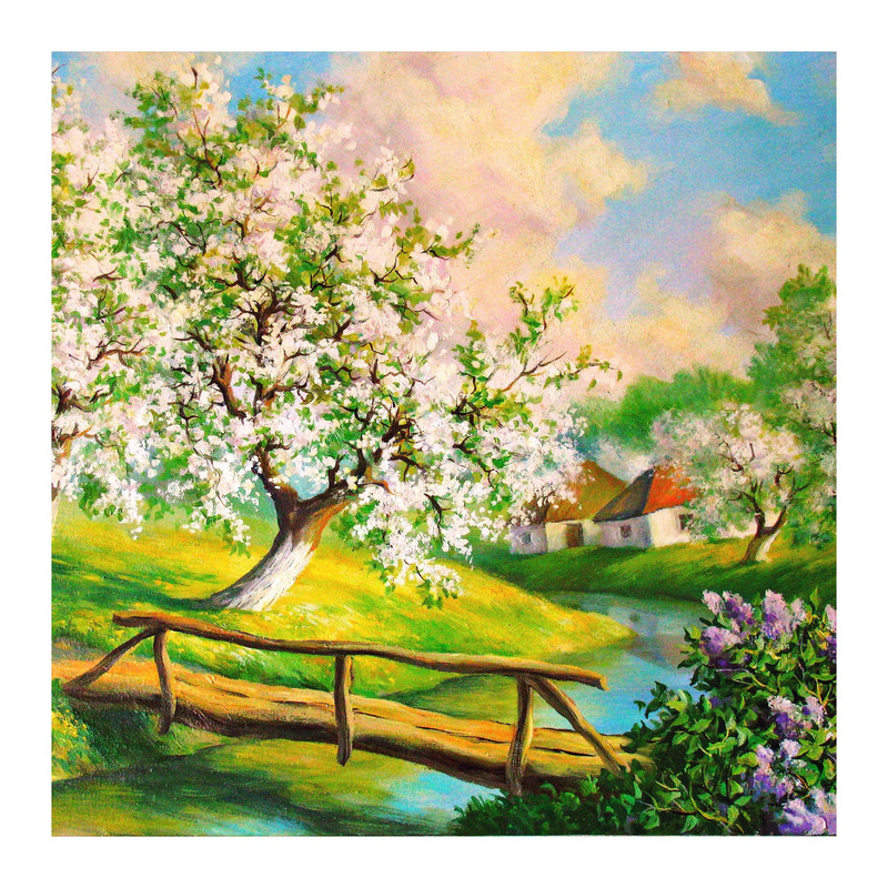 تابلو شاسی مدل R1010 طرح نقاشی منظره بهار و شکوفه و کلبه