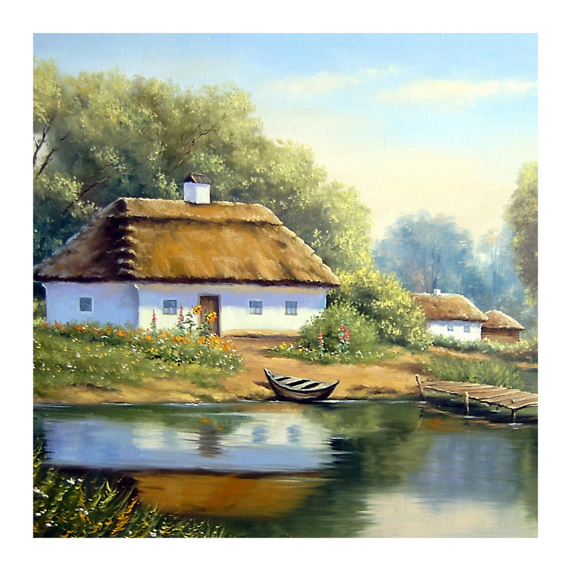 تابلو شاسی مدل R1014 طرح نقاشی منظره برکه و قایق و کلبه و جنگل