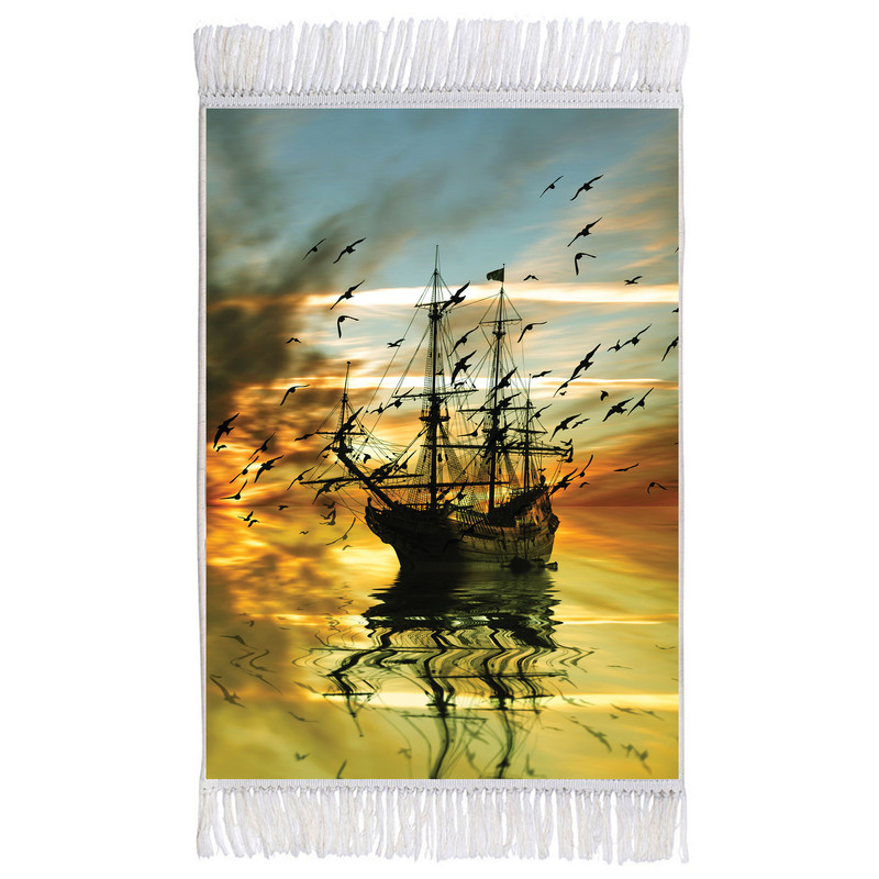 فرش ماشینی دیوارکوب اطلس آبی طرح کشتی و دریا و پرنده مدل T1023