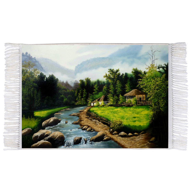 فرش ماشینی دیوارکوب اطلس آبی طرح نقاشی منظره جنگل درخت رودخانه مدل T1098