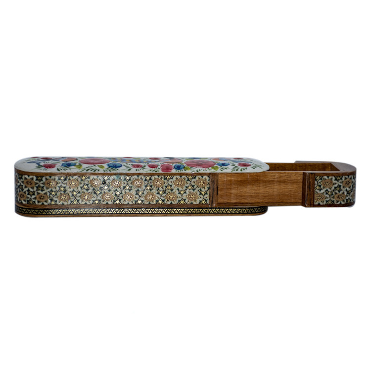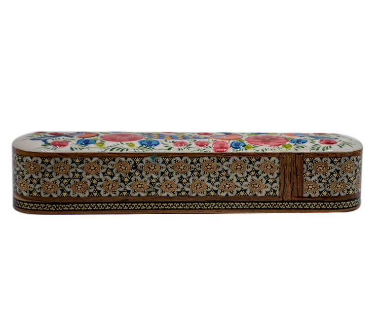 جا قلمی خاتمکاری، ترکیبی از کاربرد روزمره و زیبایی هنر سنتی ایرانی است. این قطعه دستساز، مناسب برای نگهداری قلم، خودکار، مداد و لوازم کوچک روی میز کار یا میز مطالعه است و جلوهای خاص به فضای شما میبخشد.