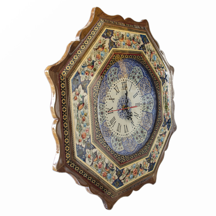 یک ساعت دستساز ایرانی با خاتمکاری ظریف و طرح اصیل گل و مرغ که جلوهای خاص و سنتی به فضای خانه یا محل کار شما میبخشد. این ساعت، ترکیبی از کاربرد روزمره و زیبایی هنری است و هر نگاه به آن حس اصالت ایرانی را منتقل میکند.